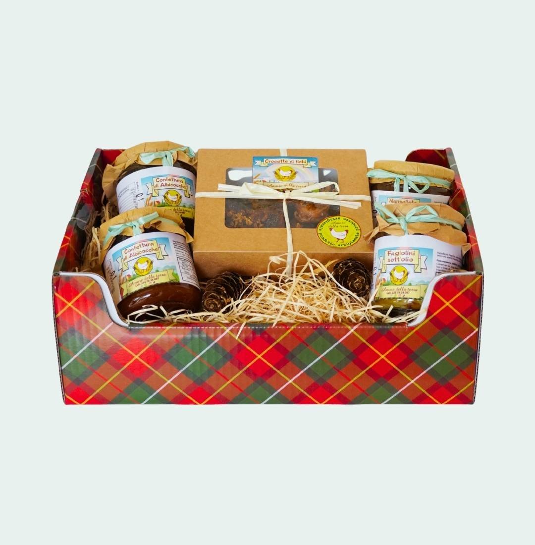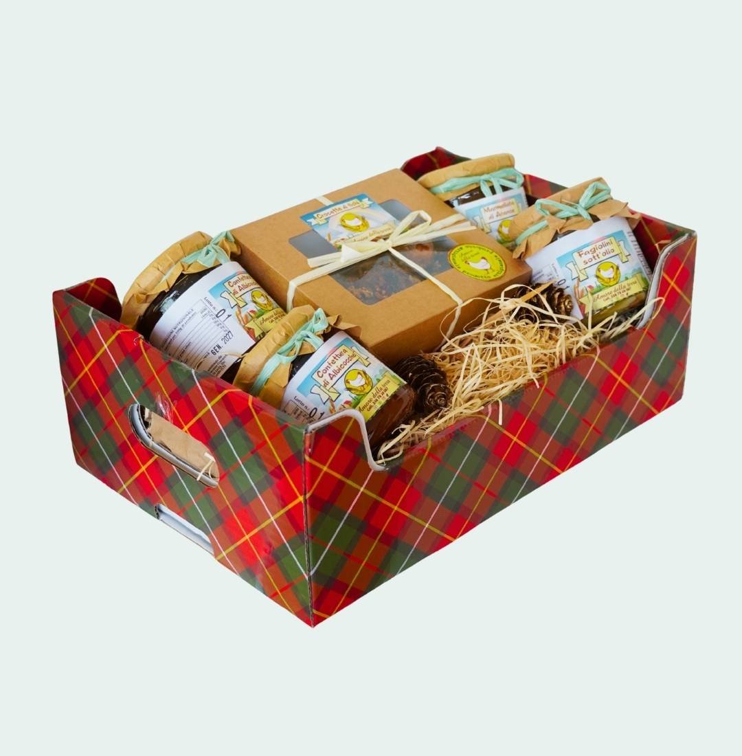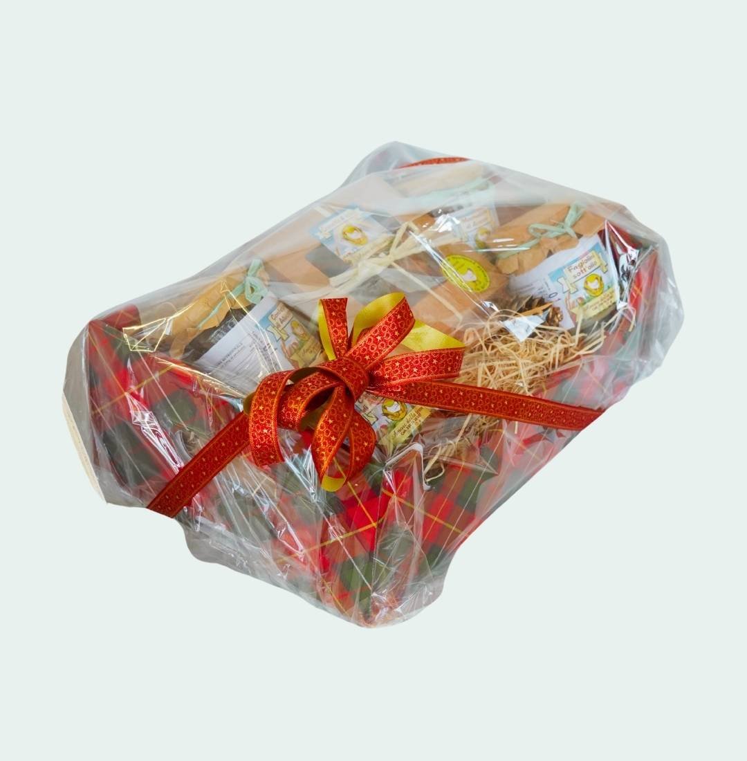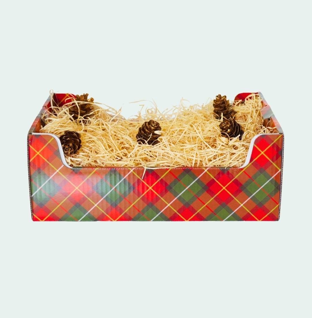 Cesta regalo in cartone con motivo tartan natalizio rosso/verde oppure solo oro, completa di paglia di legno per protezione e presentazione dei prodotti con varie decorazioni. Disponibile tutto l’anno.