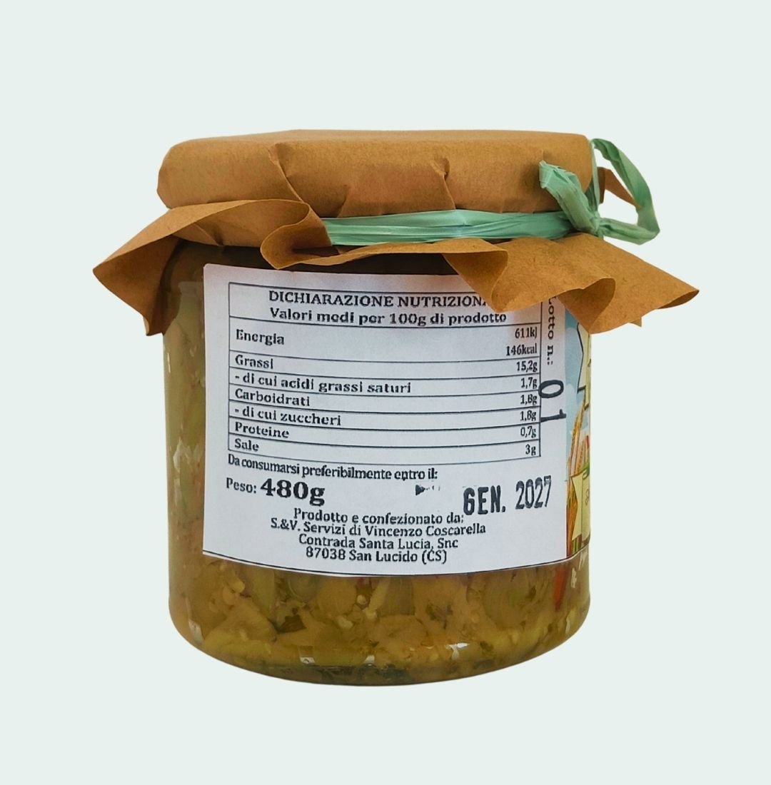 Con aglio, peperoncino, menta, finocchietto selvatico in olio di semi di girasole.