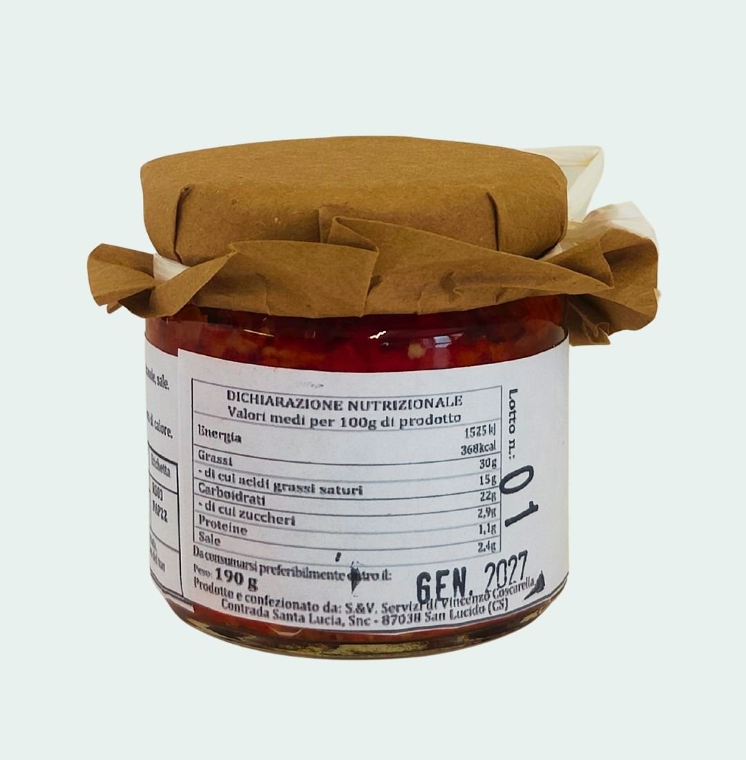 Molto più di semplici peperoncini! La scelta di escludere i semini e lavorazione tritata dei nostri peperoncini è una ricetta che più rispecchia le tipicità dei paesi mediterranei, che aggiungendo un pizzico di questo rinomato ortaggio ovunque nelle pietanze hanno fatto del peperoncino il signore dei condimenti. Abbiamo realizzato questa crema aggiungendo l’aroma dell’aglio e del basilico per esaltarne il gusto e renderla ancora più particolare. Ideale per accompagnare antipasti, per farcire tartine e crostini oppure per condire sughi e primi piatti. Ne basterà un cucchiaio per i più audaci per sapore, vivacità e inconfondibile colore alla vostra tavola.